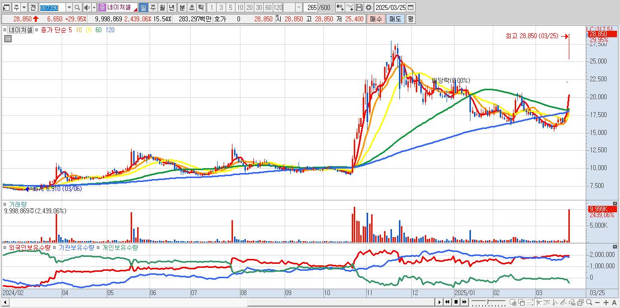 - 네이처셀 (28,850원 ▲ 29.95% , 시총: 18,567억, 거래량: 5,870,137, 거래대금:1,666억)