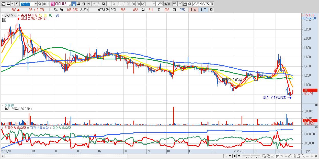 - 아이톡시 (882원 ▲ 12.07% , 시총: 432억, 거래량: 1,163,169, 거래대금:10억)