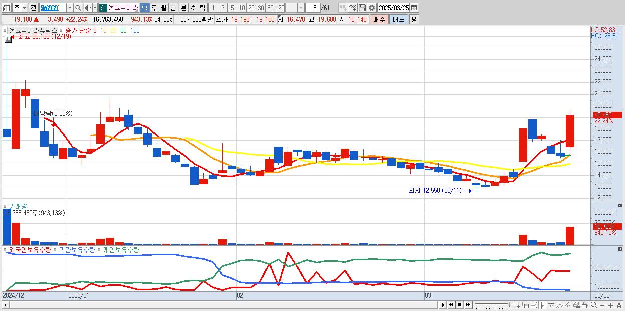 - 온코닉테라퓨틱스 (19,180원 ▲ 22.24% , 시총: 2,087억, 거래량: 16,763,450, 거래대금:3,076억)