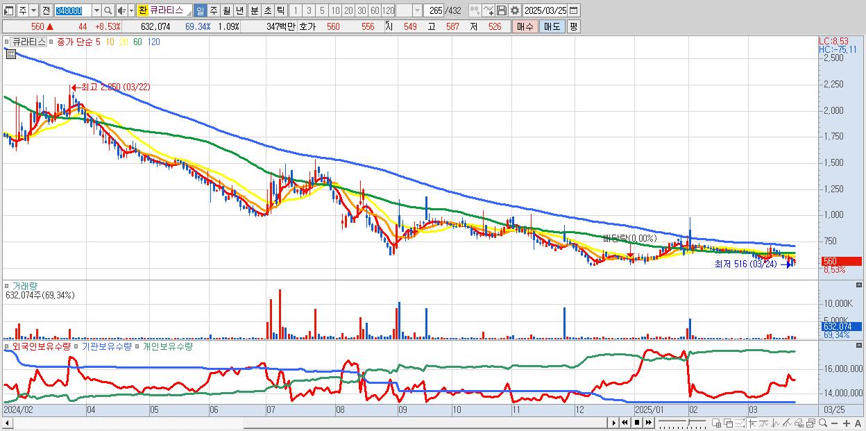 - 큐라티스 (560원 ▲ 8.53% , 시총: 325억, 거래량: 632,074, 거래대금:3억)