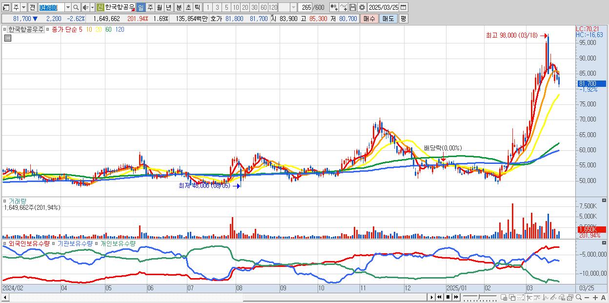 2.한국항공우주 82,000원 ▼ -2.26% (KOSPI, 047810)