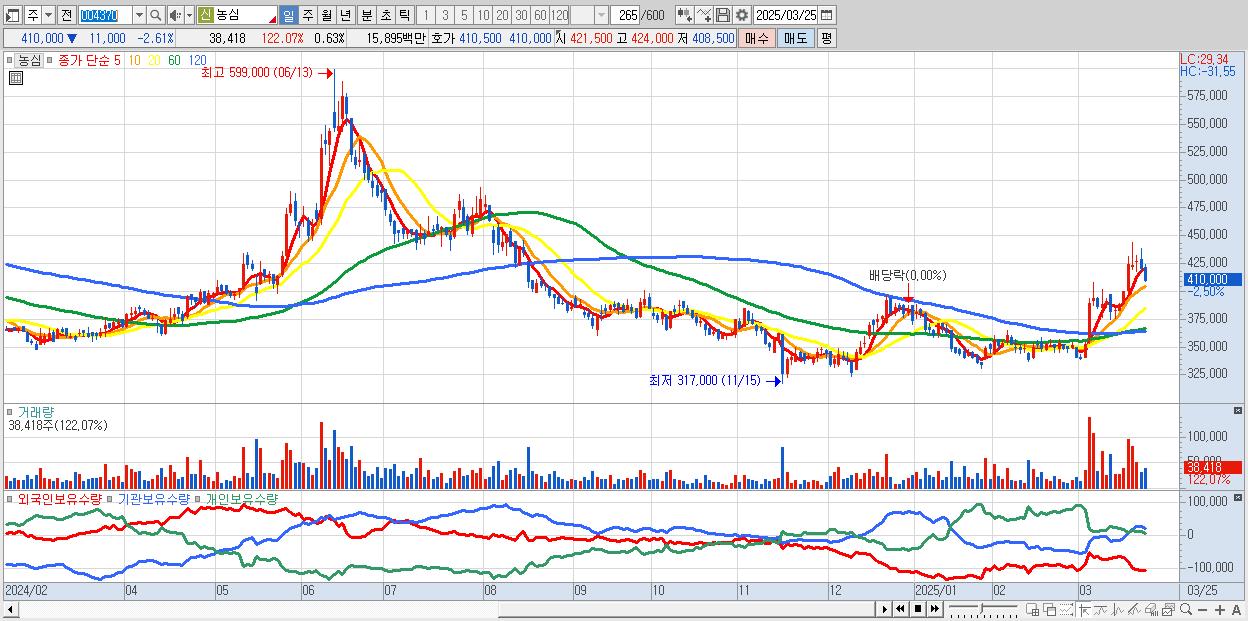 - 농심 (412,500원 ▼ -2.02% , 시총: 25,091억, 외국인 순매수 거래금:51억)