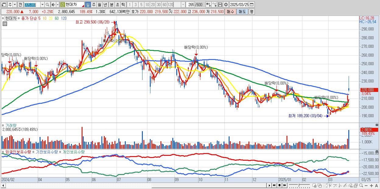 현대자동차가 210억 달러(31조 원) 규모 대미 투자가 시장에서도 긍정 평가를 받은 모양새다. 도널드 트럼프 대통령으로부터 ‘관세 면제’ 발언을 얻어낸 이후 22만 원대를 회복했다. 기아(2.13%), 현대모비스(0.72%) 등도 덩달아 올랐다. 25일 한국거래소에 따르면 현대차 주가는 전일 보다 3.29% 오른 22만원에 마감했다. 현대차그룹의 미국 투…
