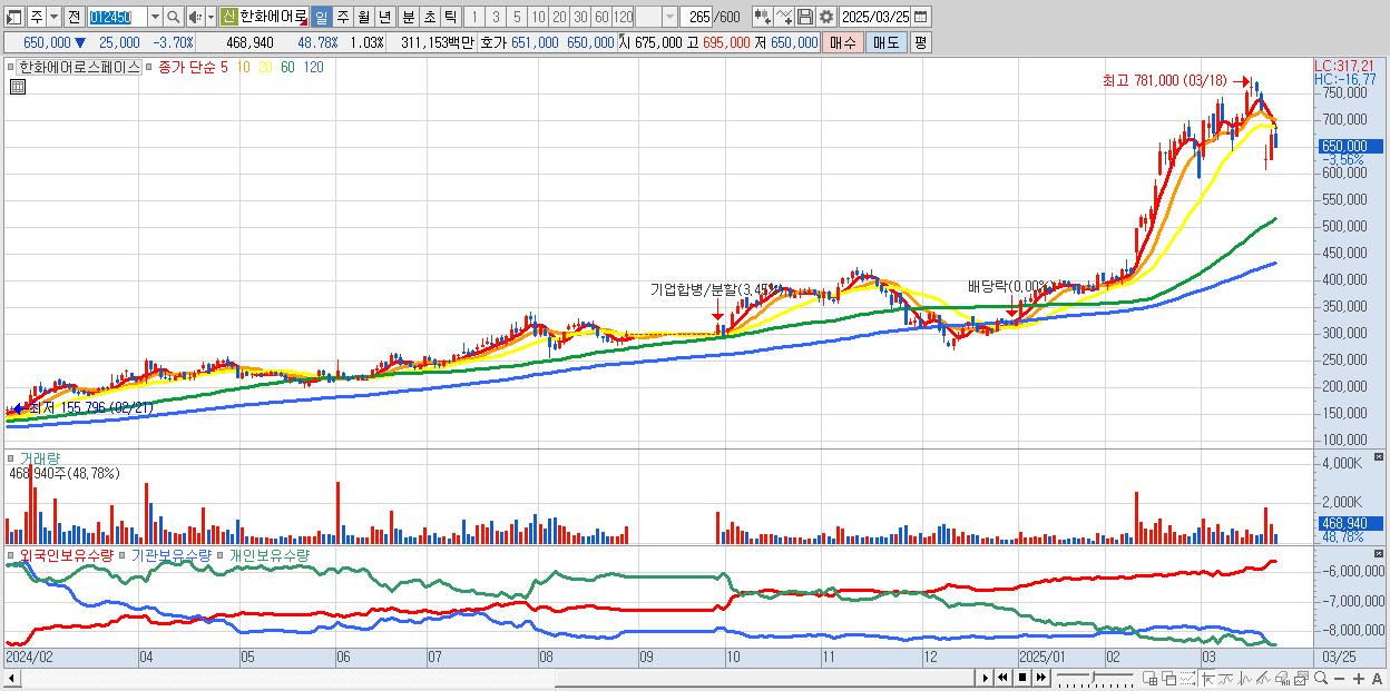 - 한화에어로스페이스 (654,000원 ▼ -3.11% , 시총: 298,101억, 외국인 순매수 거래금:86억)