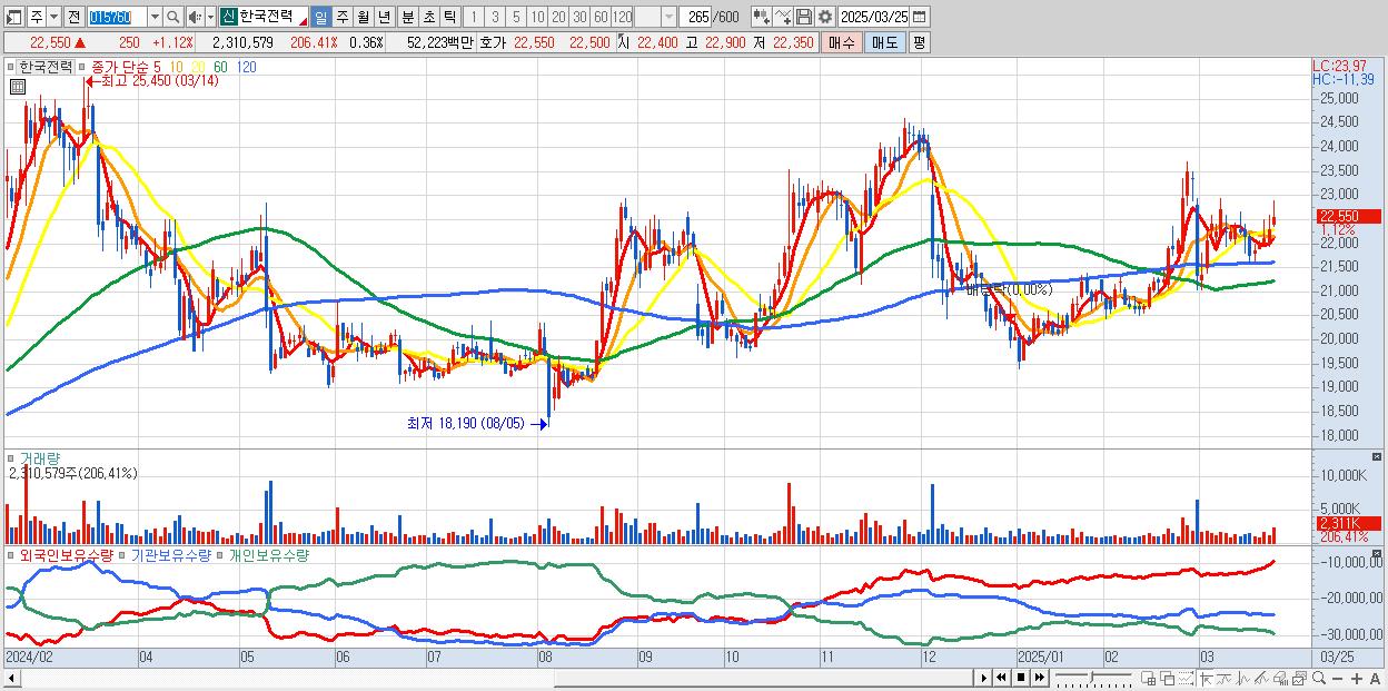 - 한국전력 (22,600원 ▲ 1.35% , 시총: 145,084억, 외국인 순매수 거래금:135억)