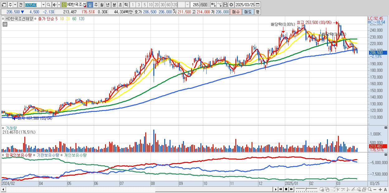 - HD한국조선해양 (207,000원 ▼ -1.9% , 시총: 146,500억, 외국인 순매수 거래금:135억)