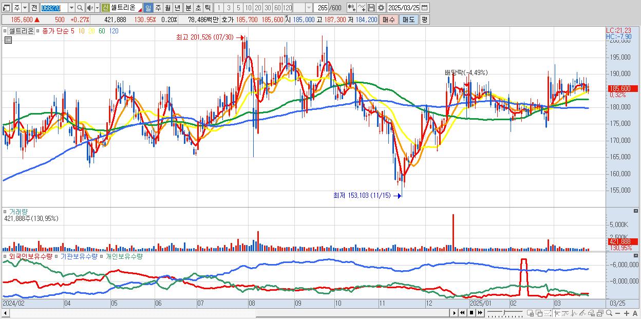 - 셀트리온 (186,000원 ▲ 0.49% , 시총: 398,241억, 외국인 순매수 거래금:90억)