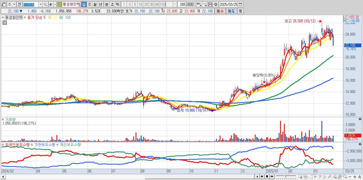 - 동성화인텍 (22,100원 ▼ -6.16% , 시총: 6,628억, 외국인 순매수 거래금:70억)