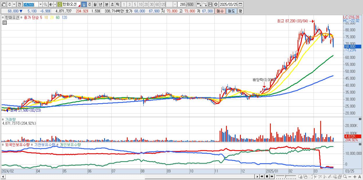 - 한화오션 (68,500원 ▼ -6.29% , 시총: 209,893억, 외국인 순매수 거래금:144억)