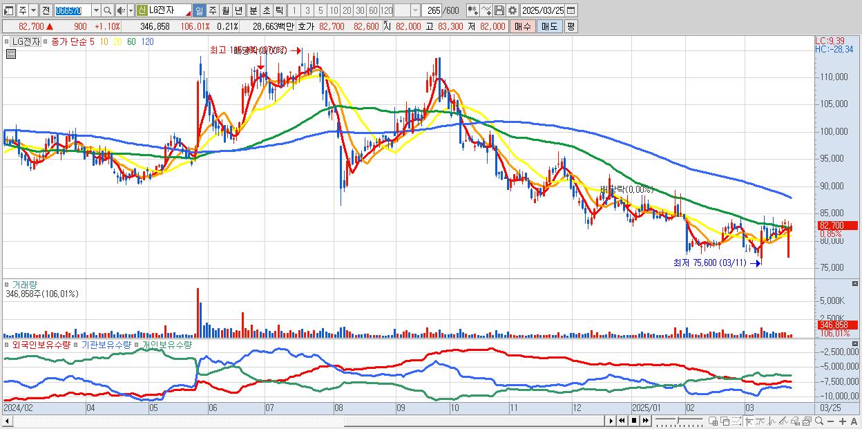 - LG전자 (82,800원 ▲ 1.22% , 시총: 135,500억, 외국인 순매수 거래금:45억)