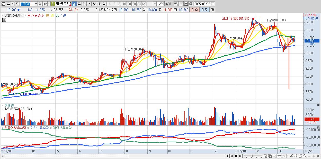 - BNK금융지주 (10,780원 ▼ -1.37% , 시총: 34,322억, 외국인 순매수 거래금:60억)