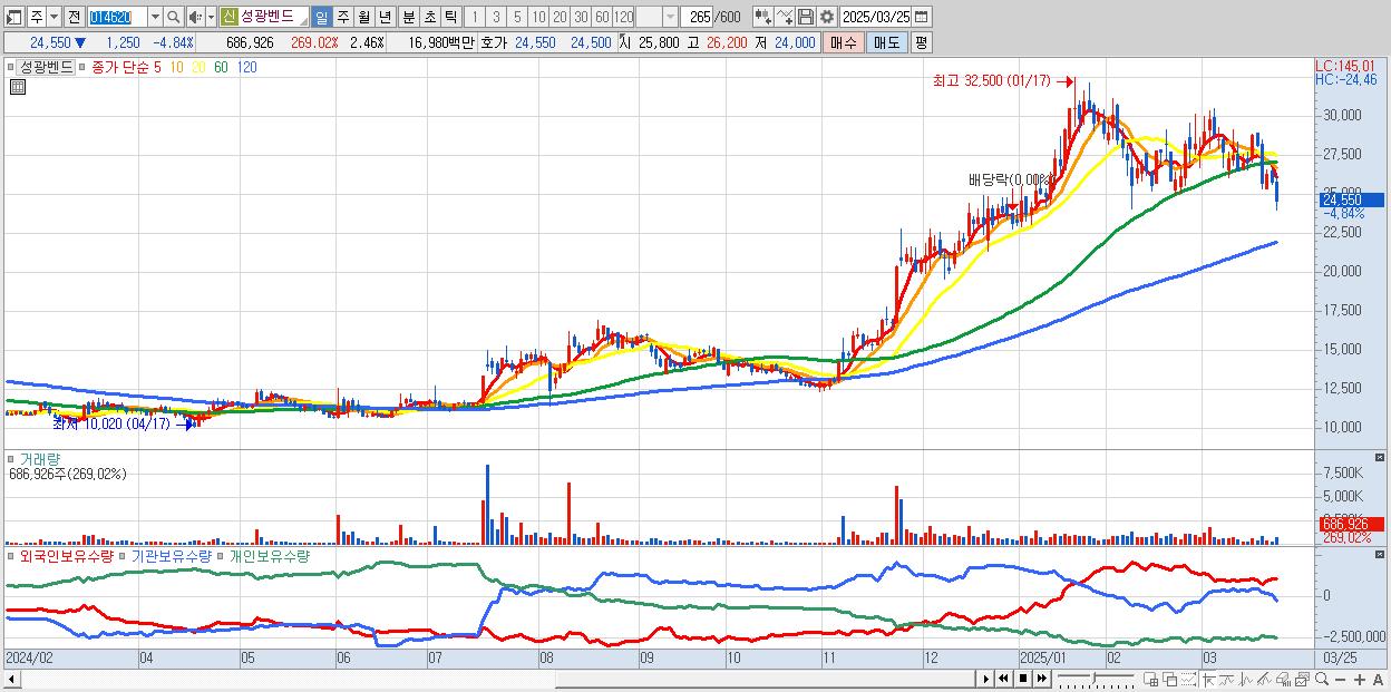 - 성광벤드 (24,550원 ▼ -4.84% , 시총: 6,856억, 외국인 순매수 거래금:51억)