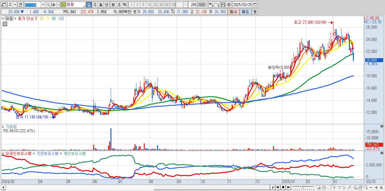 - 태광 (20,600원 ▼ -6.36% , 시총: 5,459억, 외국인 순매수 거래금:51억)