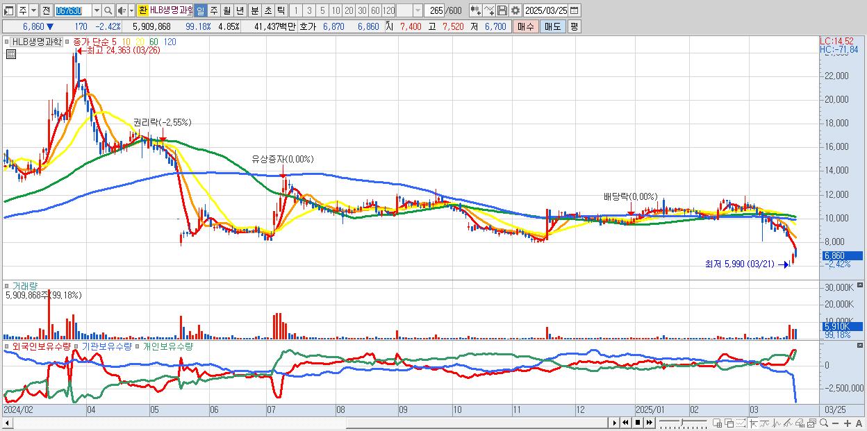 - HLB생명과학 (6,860원 ▼ -2.42% , 시총: 8,362억, 외국인 순매수 거래금:47억)