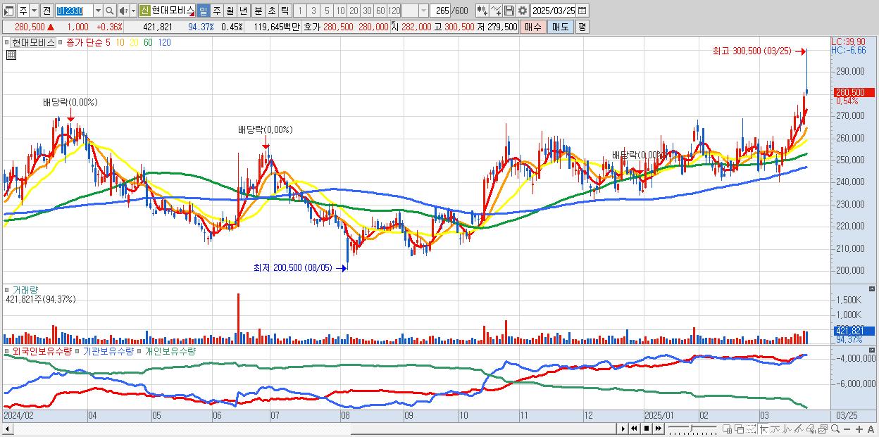 1.현대모비스 281,500원 ▲ 0.72% (KOSPI, 012330)