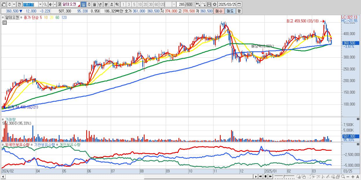 - 알테오젠 (362,000원 ▼ -2.82% , 시총: 193,014억, 외국인 순매수 거래금:109억)