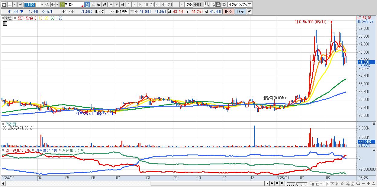 - 한화 (42,300원 ▼ -2.53% , 시총: 31,708억, 외국인 순매수 거래금:75억)