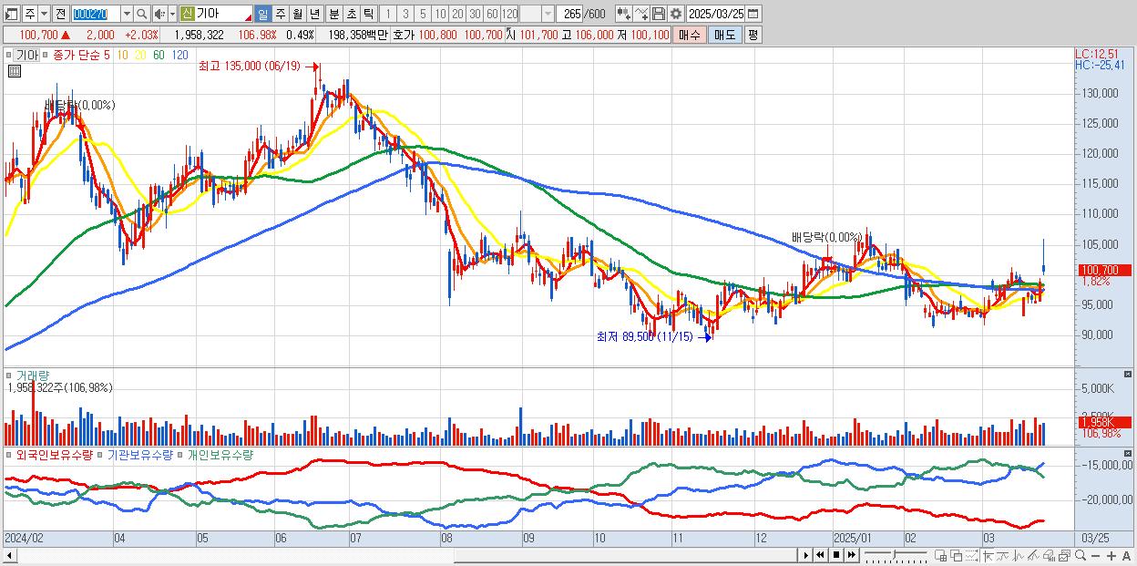 - 기아 (100,800원 ▲ 2.13% , 시총: 400,854억, 외국인 순매수 거래금:123억)