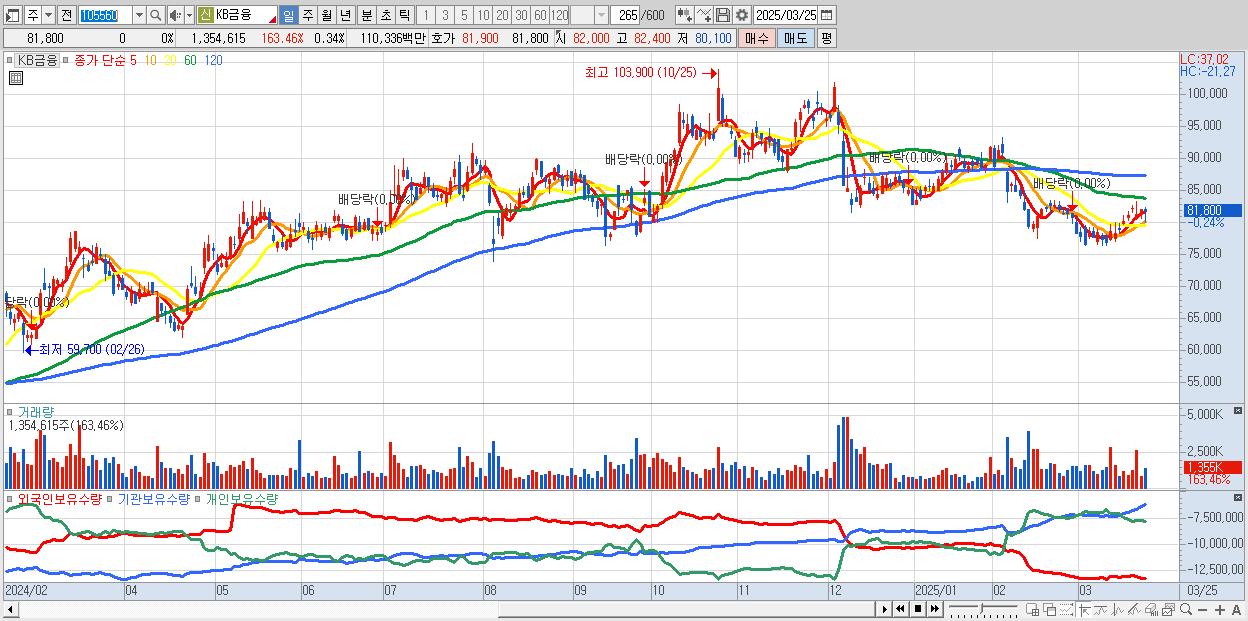 - KB금융 (81,900원 ▲ 0.12% , 시총: 322,300억, 거래량: 1,311,376, 거래대금:1,068억)