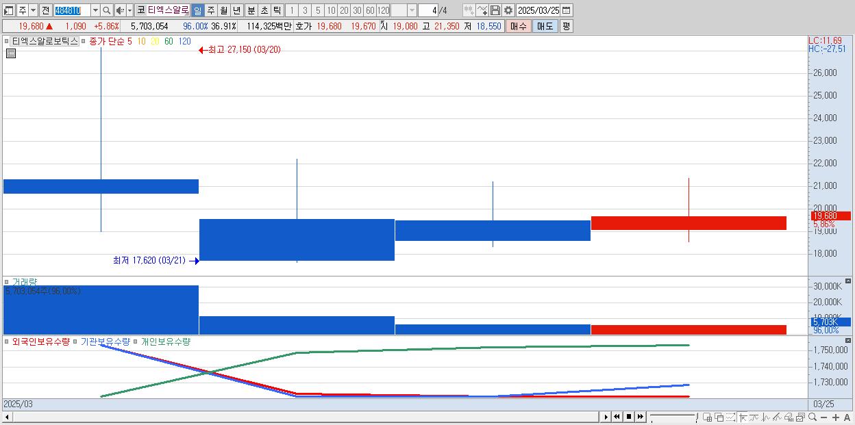 - 티엑스알로보틱스 (19,680원 ▲ 5.86% , 시총: 3,041억, 거래량: 5,703,054, 거래대금:1,143억)