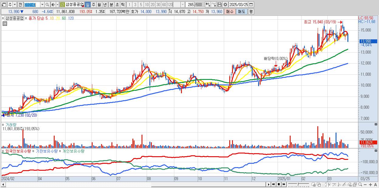 - 삼성중공업 (14,000원 ▼ -4.57% , 시총: 123,200억, 거래량: 8,624,345, 거래대금:1,219억)