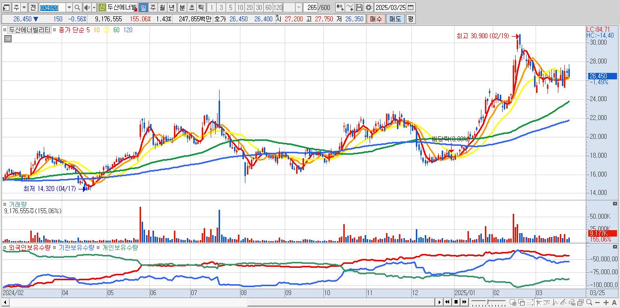 - 두산에너빌리티 (26,550원 ▼ -0.19% , 시총: 170,069억, 거래량: 6,096,858, 거래대금:1,647억)