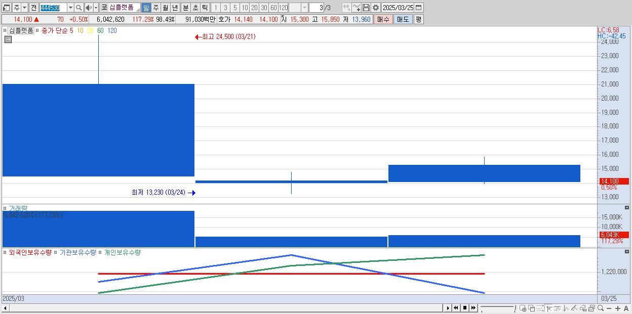 - 심플랫폼 (14,100원 ▲ 0.5% , 시총: 865억, 거래량: 6,042,620, 거래대금:910억)