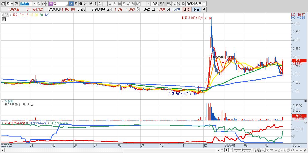 - CS (1,893원 ▲ 24.38% , 시총: 367억, 거래량: 1,739,666, 거래대금:30억)