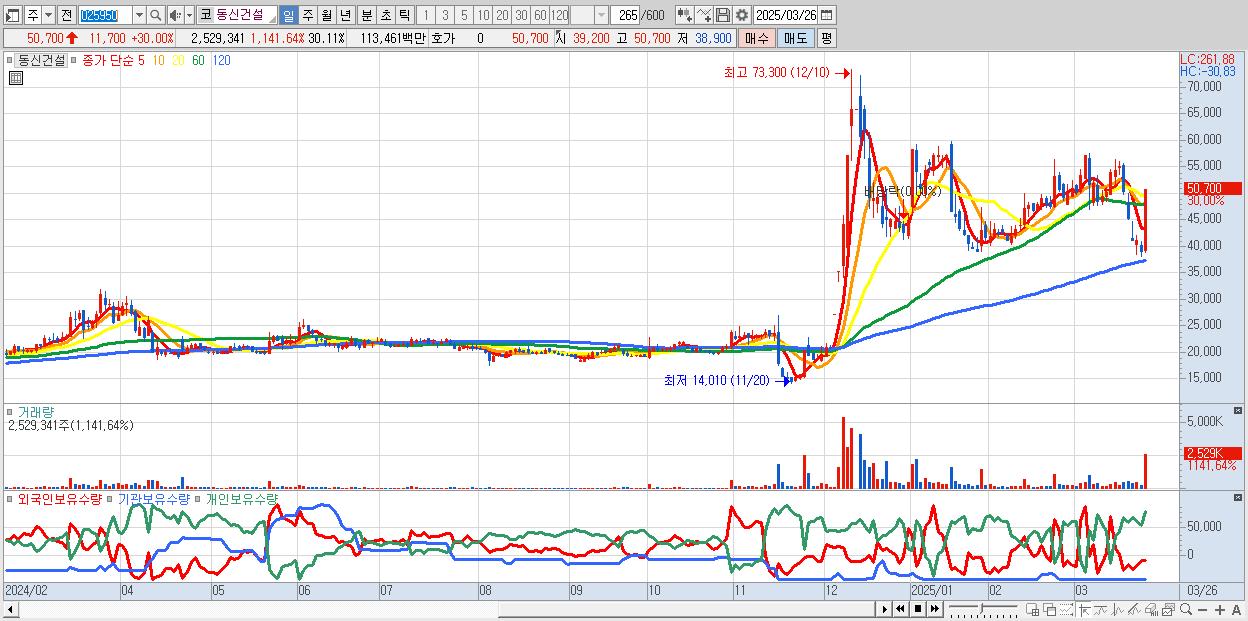 - 동신건설 (50,700원 ▲ 30% , 시총: 4,259억, 거래량: 2,529,341, 거래대금:1,135억)