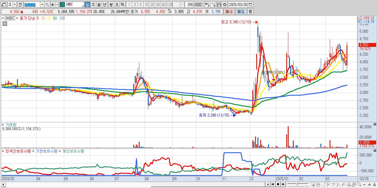 - iMBC (4,550원 ▲ 16.52% , 시총: 1,047억, 거래량: 6,084,585, 거래대금:268억)