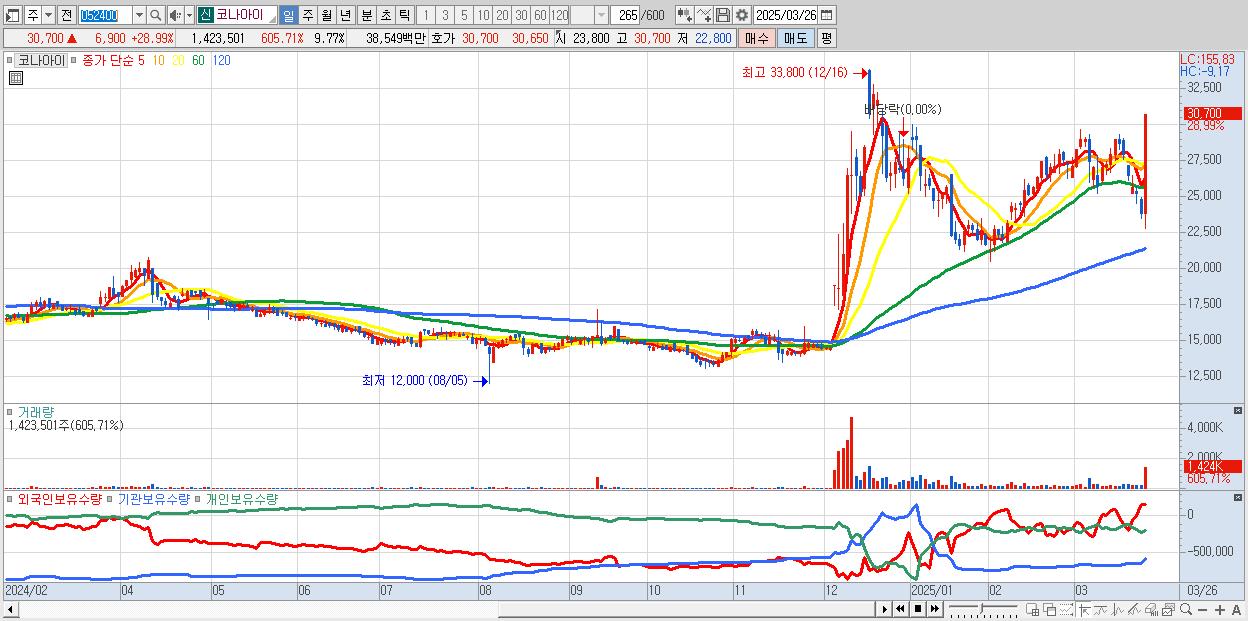 - 코나아이 (30,700원 ▲ 28.99% , 시총: 4,471억, 거래량: 1,423,501, 거래대금:385억)
