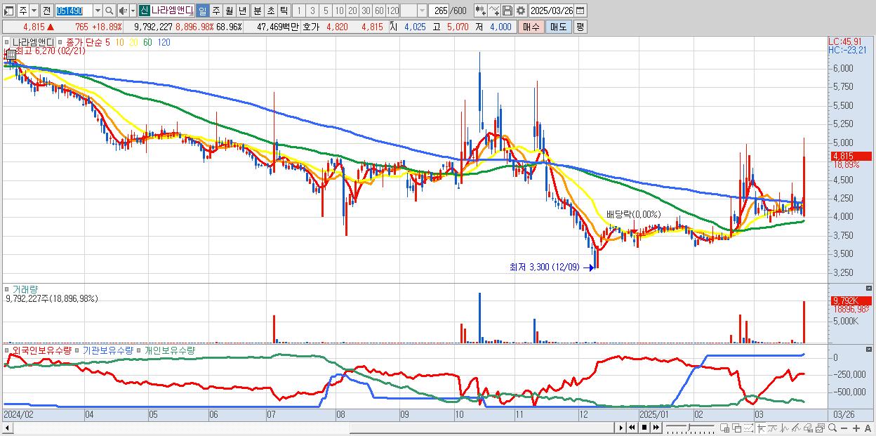 - 나라엠앤디 (4,815원 ▲ 18.89% , 시총: 684억, 거래량: 9,792,227, 거래대금:475억)