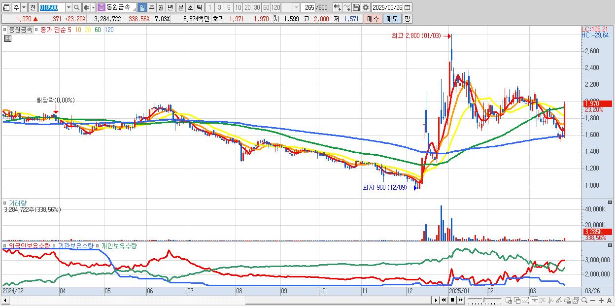 - 동원금속 (1,970원 ▲ 23.2% , 시총: 921억, 거래량: 3,284,722, 거래대금:59억)