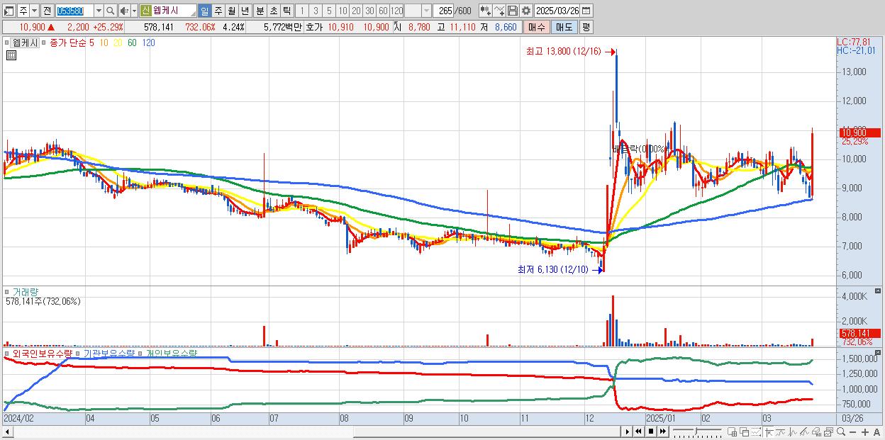 - 웹케시 (10,900원 ▲ 25.29% , 시총: 1,486억, 거래량: 578,141, 거래대금:58억)