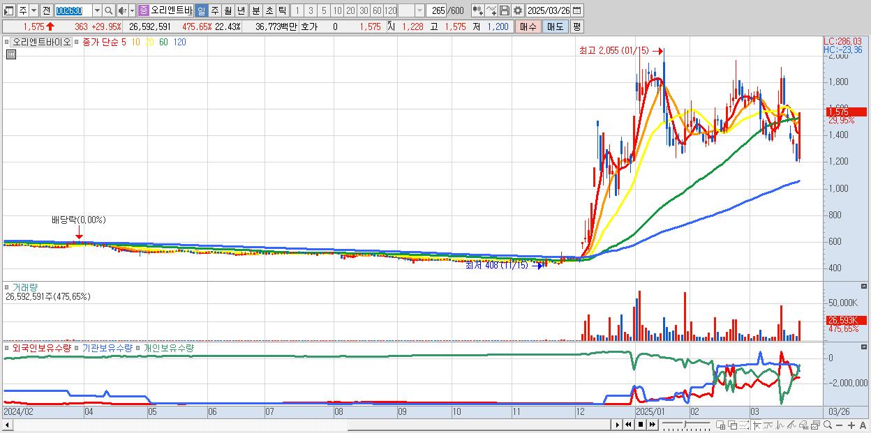 - 오리엔트바이오 (1,575원 ▲ 29.95% , 시총: 1,868억, 거래량: 26,592,591, 거래대금:368억)