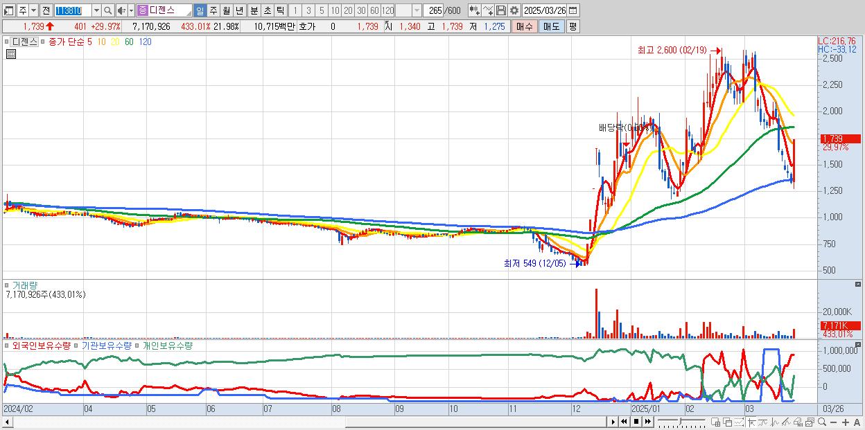 - 디젠스 (1,739원 ▲ 29.97% , 시총: 567억, 거래량: 7,170,926, 거래대금:107억)