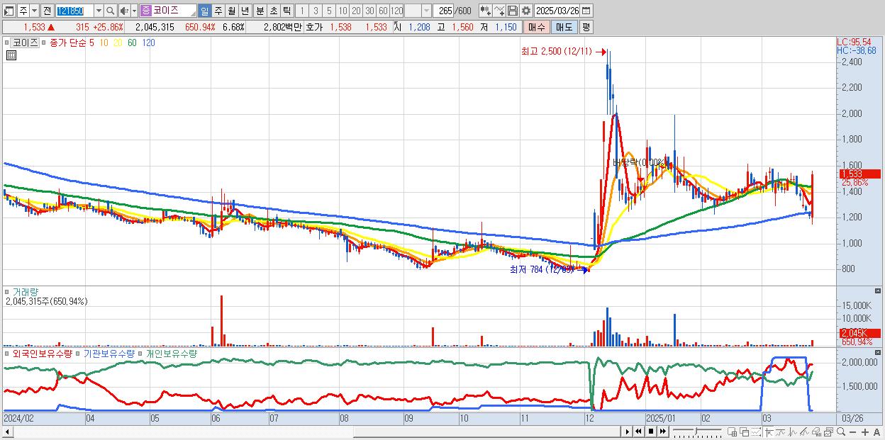 - 코이즈 (1,533원 ▲ 25.86% , 시총: 469억, 거래량: 2,045,315, 거래대금:28억)