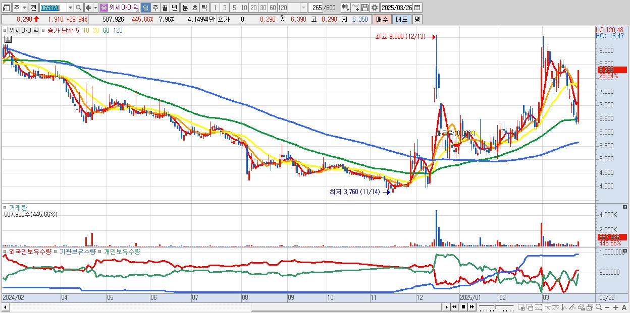 - 위세아이텍 (8,290원 ▲ 29.94% , 시총: 612억, 거래량: 587,926, 거래대금:41억)