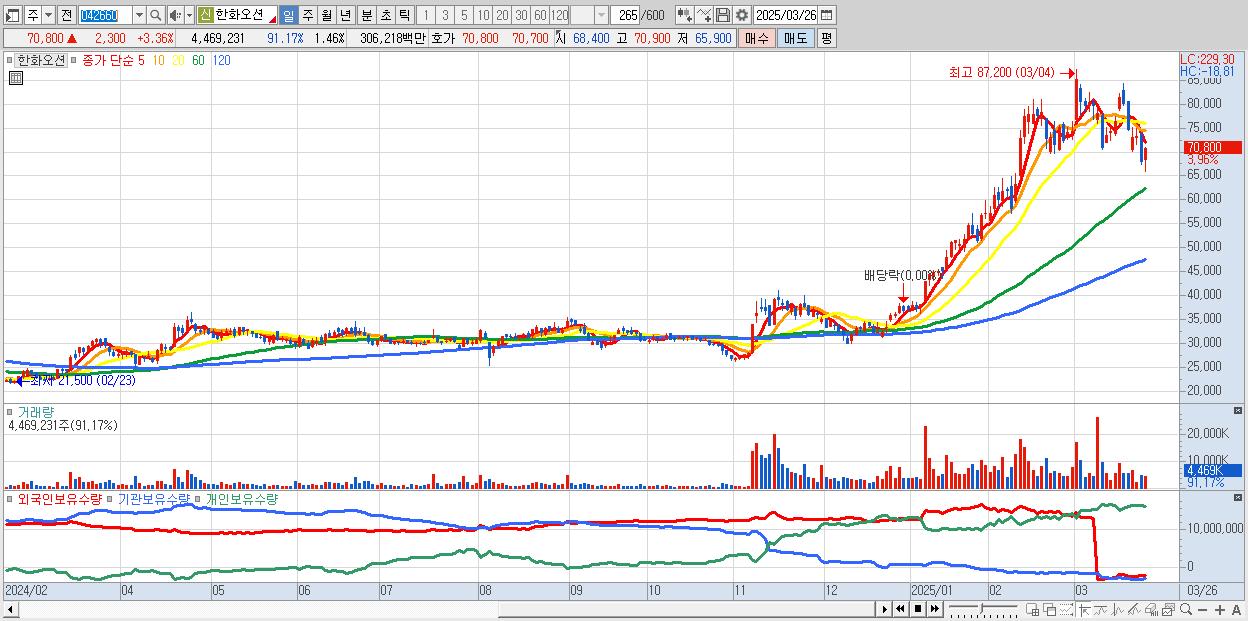 - 한화오션 (70,400원 ▲ 2.77% , 시총: 215,715억, 외국인 순매수 거래금:83억)