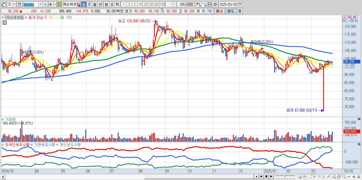 - DB손해보험 (98,000원 0% , 시총: 69,384억, 외국인 순매수 거래금:104억)