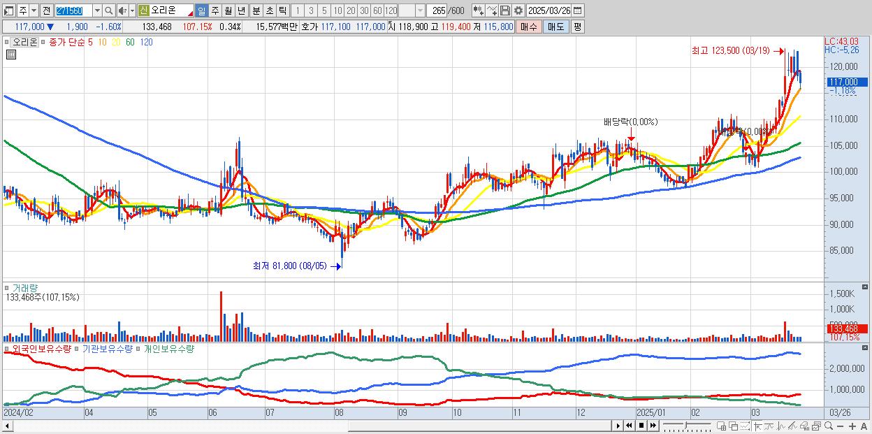 - 오리온 (116,300원 ▼ -2.19% , 시총: 45,981억, 외국인 순매수 거래금:49억)