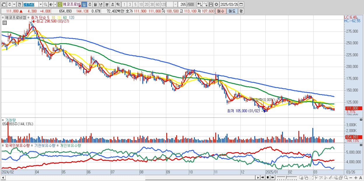 - 에코프로비엠 (111,400원 ▲ 3.63% , 시총: 108,951억, 외국인 순매수 거래금:96억)