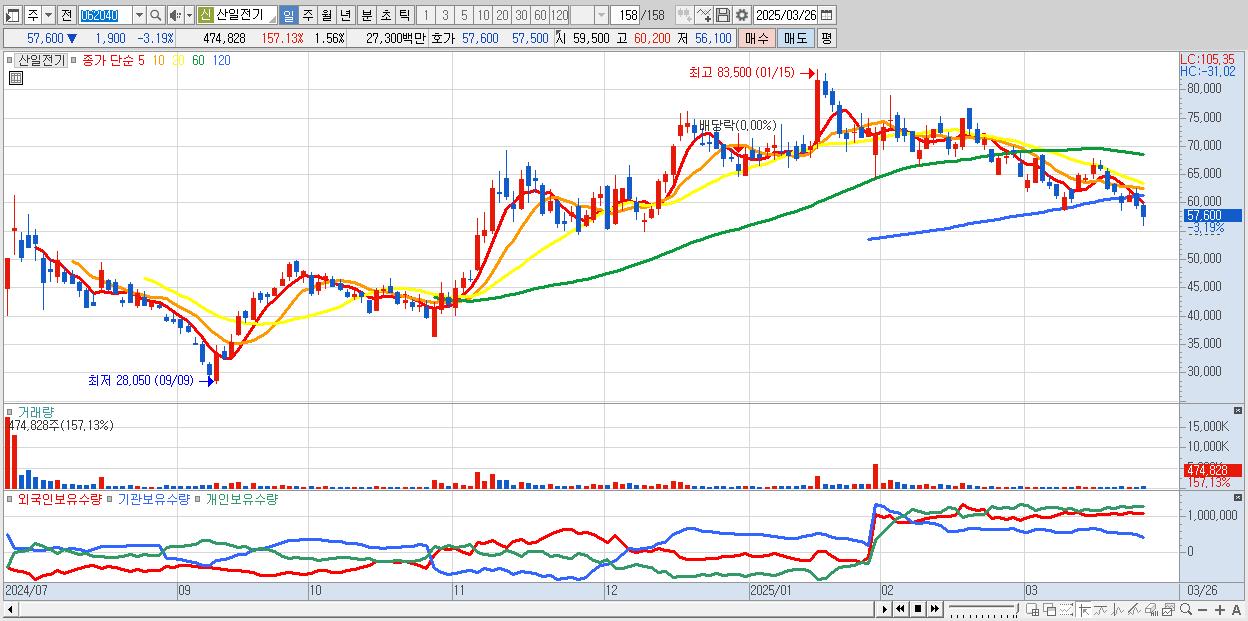 - 산일전기 (57,600원 ▼ -3.19% , 시총: 17,536억, 외국인 순매수 거래금:63억)