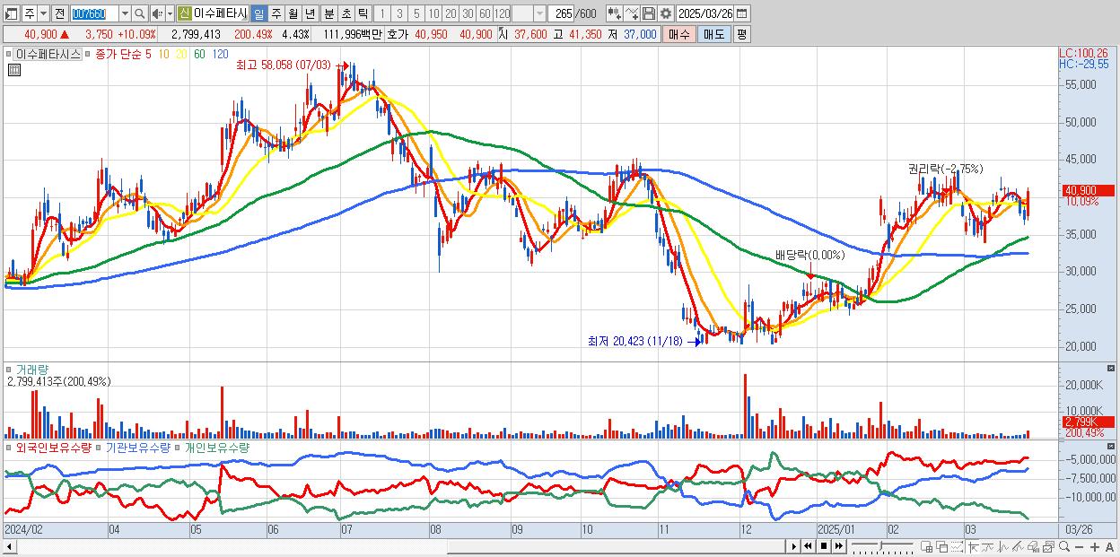 - 이수페타시스 (40,900원 ▲ 10.09% , 시총: 25,868억, 외국인 순매수 거래금:35억)