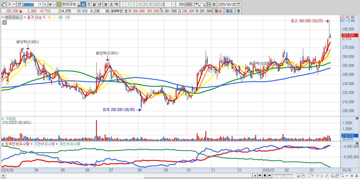 - 현대모비스 (285,500원 ▲ 1.42% , 시총: 265,501억, 외국인 순매수 거래금:171억)