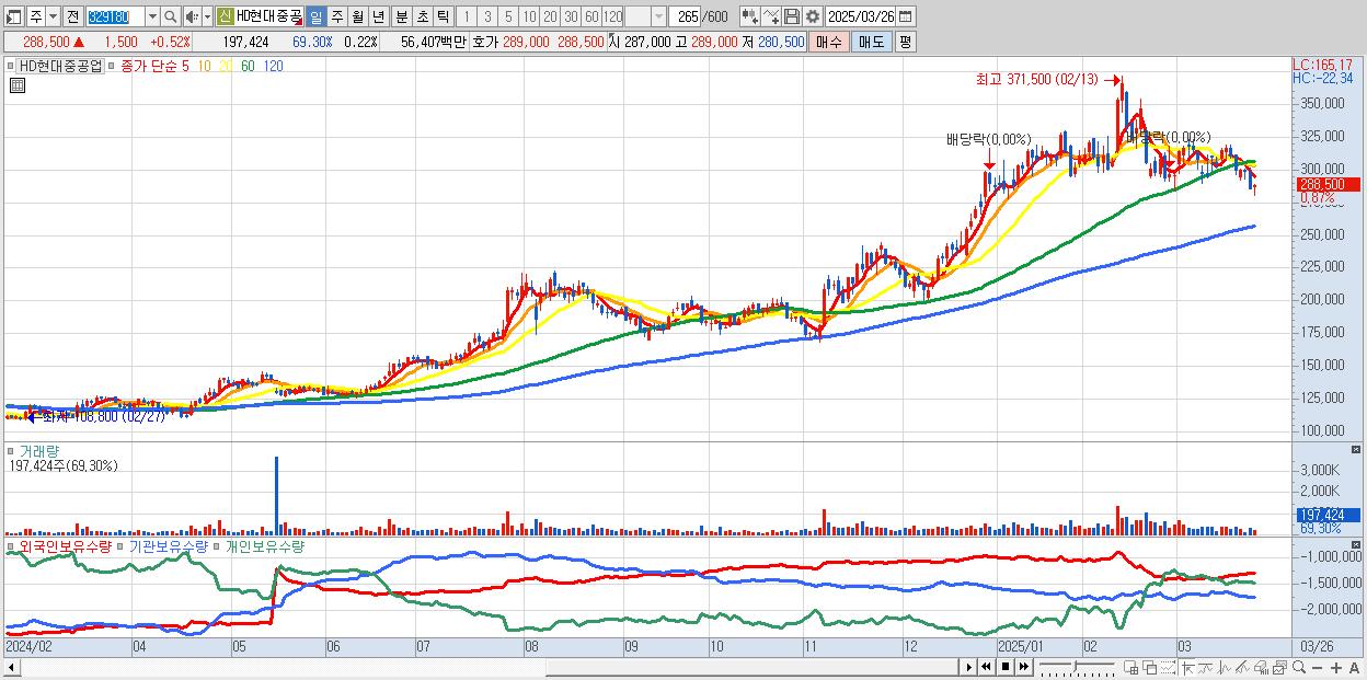 - HD현대중공업 (288,000원 ▲ 0.35% , 시총: 255,667억, 외국인 순매수 거래금:88억)