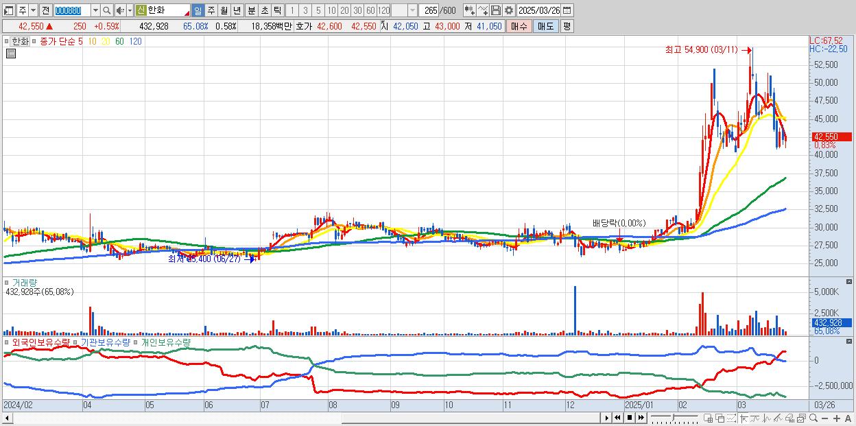 - 한화 (42,750원 ▲ 1.06% , 시총: 32,045억, 외국인 순매수 거래금:49억)