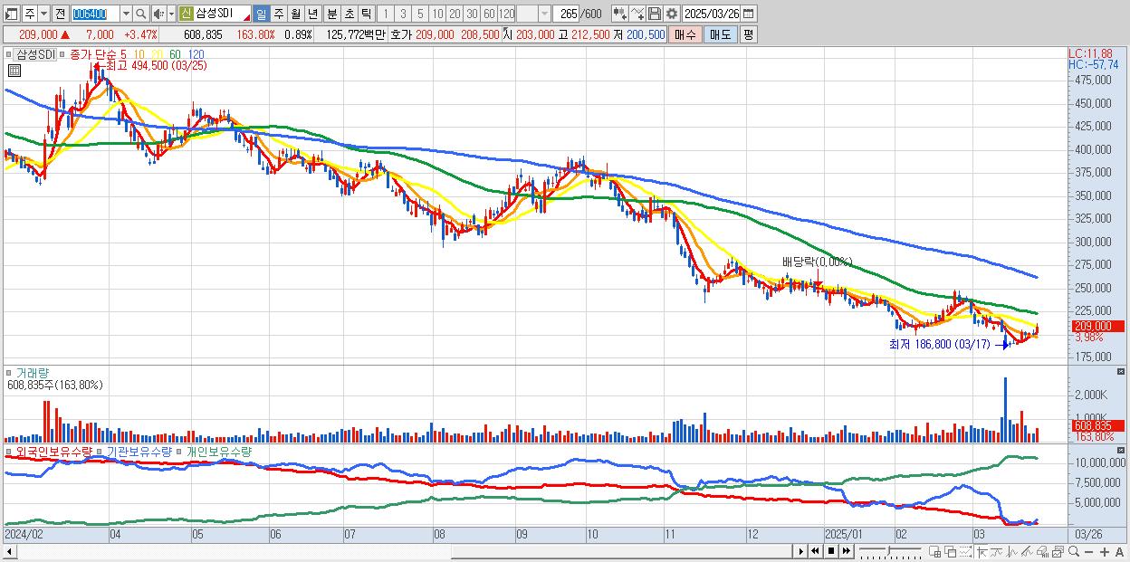 - 삼성SDI (208,500원 ▲ 3.22% , 시총: 143,374억, 외국인 순매수 거래금:224억)