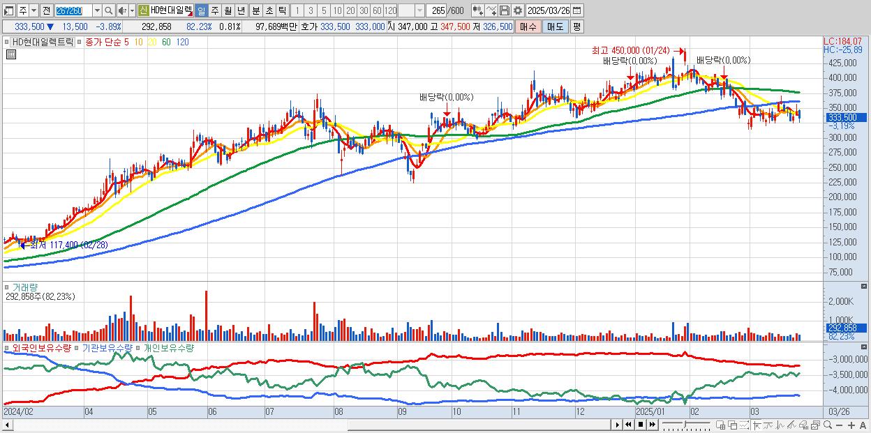 - HD현대일렉트릭 (333,000원 ▼ -4.03% , 시총: 120,037억, 거래량: 240,010, 거래대금:800억)