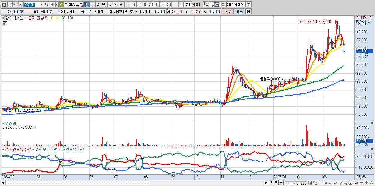 - 한화시스템 (34,250원 ▲ 0.15% , 시총: 64,705억, 거래량: 2,771,452, 거래대금:952억)